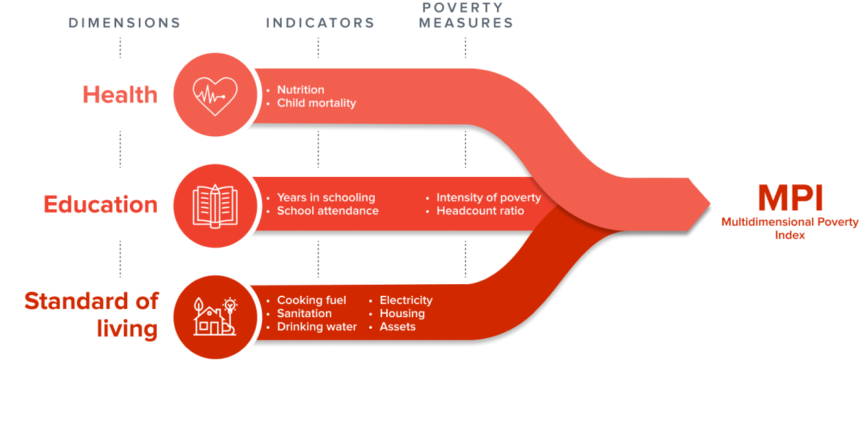 Poverty is multidimensional and it is measured by a combination of indicators such as but not limited to nutrition, years of schooling, child mortality, sanitation, drinking water access, electricity, etc. All these are combined, calculated, and measured as Multidimensional Poverty Index (MPI). MPI falls within the range of 0 and 1. The lower MPI values (0 to 0.5) represent a better performance regarding multidimensional poverty.