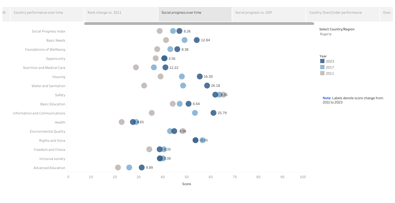 As you can see, the percentage increase between 2017 and 2023 is smaller than what it was between 2011 and 2017. This shows that Nigeria’s social progress declined in 2023 even though it has been increasing since 2011. There was a 5.62 % point change between 2011 and 2017, and a 2.64 % point change between 2017 and 2023. Mathematically, this is more like a